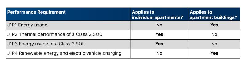 The following table outlines which Performance Requirements apply to individual apartments and to apartment buildings.